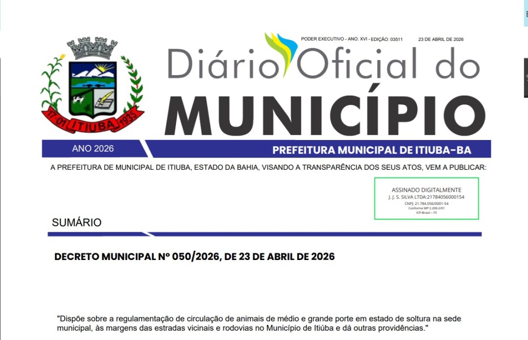 A Prefeitura Municipal de Itiúba publicou nesta quinta-feira (23) o Decreto Municipal nº 050/2026, que regulamenta a Lei nº 234/2026, estabelecendo os procedimentos para a circulação de animais de médio e grande porte em vias públicas do município.